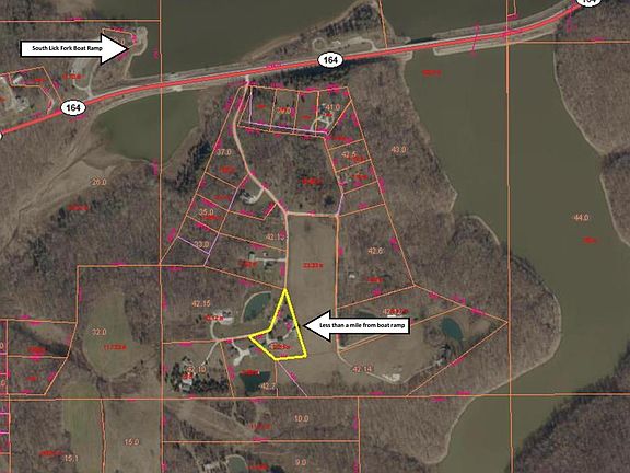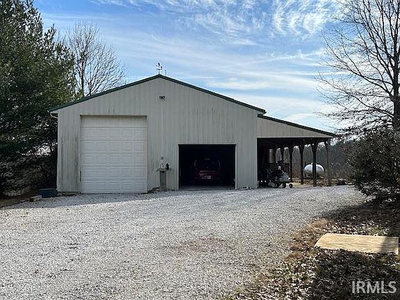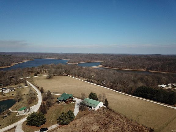 Patoka Lake Hill Top home. Walk to the lake shore and boat launch. South Lick Fork Ramp is down the driveway and across State Rd. 164. Enjoy the large windows and glass french doors onto the wide open sky deck facing in the direction of the lake. This deck wraps around to the west side covered deck that overlooks neighbors pond. Two pole barns: 15 x 32, 30 x 60 tall enough for RV's. From the west side is the walk out door to the basement driveway. Back inside the main level of this log home is the great room with a center Wood burning fireplace. Open concept living room into the kitchen. Above is the open loft with sky views out the large upper windows you see in the pictures. Loft is large enough to be two separate rooms with a shared bath and closet space. The unfinished Basement is ready for your interior design and already has a free standing steel box wood burner. Walk out basement has the 2 year old Goodman LP furnace and a/c. Marathon electric water heater and shower stall and utility type sink. Main level has full size washer and dryer included. One full bath with jetted tub on first floor, full bath on the upper loft with unfinished shower stall. walk in closet on the loft level. Country side hill top views in all directions from this home and buildings.