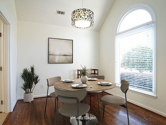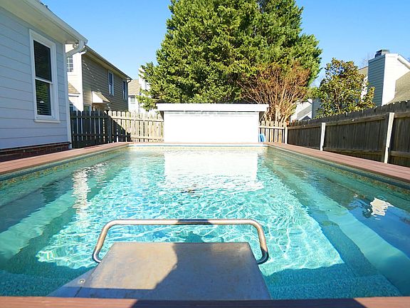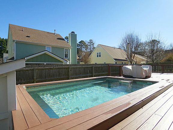 Like-New home with a first-floor owner's suite and totally updated. This open floorplan features an updated kitchen, updated bathrooms with designer fixtures, and a private 24x12 pool with an oversized deck—perfect for entertaining or grilling out. Recent improvements include HardiPlank siding, newer windows (2016), a Rinnai tankless water heater, and a roof and skylights replaced in 2017. Fresh interior paint in 2026 and exterior paint in 2025 complete the move-in-ready appeal. The fenced backyard offers both privacy and functionality. Hardwood floors run throughout, adding warmth and continuity. The formal dining room features vaulted ceilings for an open, airy feel. The family room showcases soaring two-story ceilings and a cozy gas log fireplace, ideal for everyday living and gatherings. The bright, spacious kitchen feels like new and includes granite countertops, stainless steel appliances, ample cabinetry, a breakfast bar, and an eat-in area. The first-floor primary suite offers vaulted ceilings, a walk-in closet, and an updated spa-like bath with dual vanities, a tiled walk-in shower, and a soaking tub. Two generously sized secondary bedrooms provide flexible space for guests, family, or a home office. Outdoor living shines with an oversized deck overlooking the infinity pool. Additional highlights include a two-car garage and a prime location close to popular restaurants, shopping, I-540, and RDU Airport—offering an excellent blend of comfort, updates, and convenience.