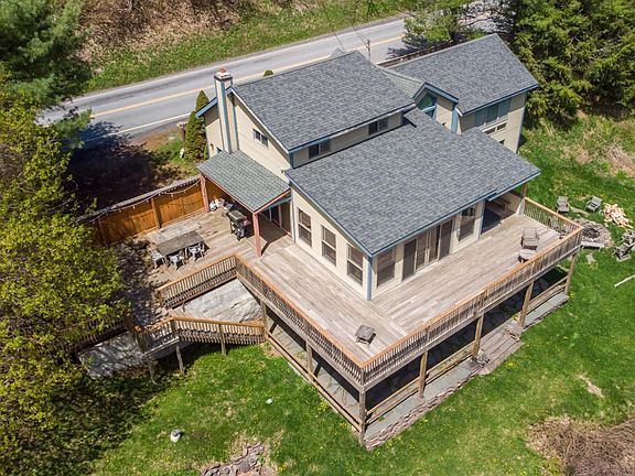 Built originally as a barn, this home has gone through several incarnations. Remnants of the original structure have been incorporated into the existing home resulting in a uniquely wonderful property. THE HOME - The main floor consists of an open living area incorporating a living room, dining room and kitchen. With windows on three sides the living room takes in the breathtaking views of the property and is a wonderful place to while away the hours. The galley kitchen features a live-edge breakfast bar and vaulted ceilings. Off of the kitchen is a loft space accessed by a spiral stair case for overflow sleeping area. Off of the living area are two large bedrooms - one featuring a wonderful stain glass window. Down stairs are another two bedrooms and a den. Original barn beams are featured through out the house. One of the outstanding features of the home is a wrap around deck that was designed to take in the amazing views this property offers. A hot tub, and several conversation areas make this a wonderful entertaining house.THE LAND - This property has it all - some of the finest views in the area, a rushing stream, a pond, open meadows and forest. The Batavia Kill Stream meanders through the property complimenting the views and adding a sensory delight. The open fields have fruit trees and give the land dimension and a bucolic feel. Stone walls and a rustic barn add a bygone feel to the property. The land is both accessible and private - there is plenty of room to roam. A fire pit and stone patio add to overall appeal of the property.The sellers have successfully rented it out on Airbnb which contribute greatly to cost of ownership. Close to skiing, hiking, fishing, golfing, non motorized boating this is a wonderful four season Catskill Mountain home. And did I mention the views - they will take your breath away!