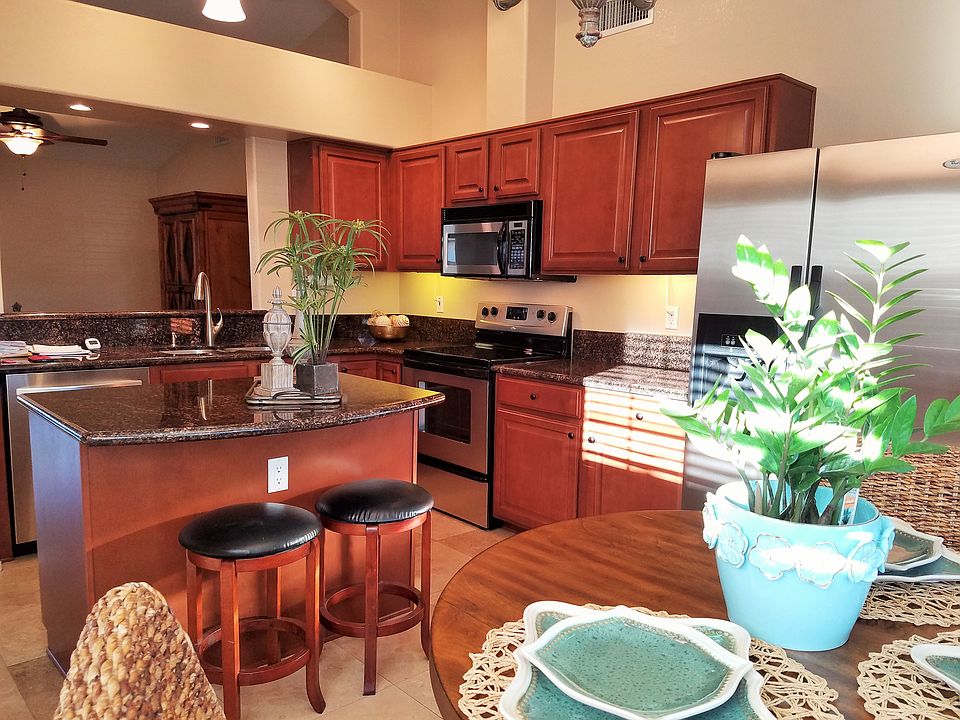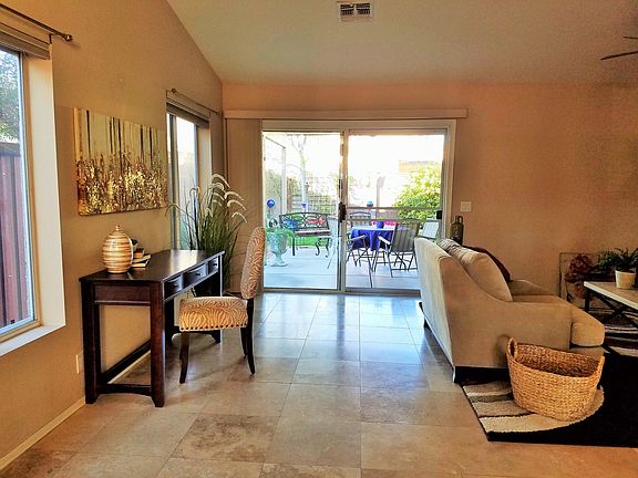 Fabulous open concept home with beautiful 18? travertine floor tiles, and vaulted ceilings! You will love the spaciousness of this home and its pristine condition! Beautiful upgrades throughout?kitchen with granite countertops, stainless appliances, island, and breakfast bar. 3 oversized bedrooms and 2 remodeled baths with granite and under mount sinks. Master has large walk in closet with shelf organizers. Newer ceiling fans, faucets, water heater, and air conditioner. New exterior paint and lights. If a beautiful yard is important to you, then come look at this garden of Eden! Oversized covered patio with popular north facing orientation.