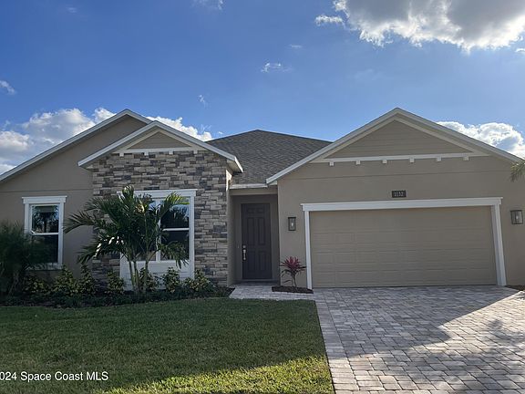 Move-In Ready! Our exceptional Evergreen French Country plan is located in the highly desirable Country Club Estates Community and features 3 Bedrooms, 2 Baths, and Flex Space that can be used as an office. Spacious Great Room overlooks expansive covered Rear Lanai - great for entertaining and outdoor living! Tile flooring is featured throughout the main living areas of the home, and the large gourmet kitchen boasts 42'' cabinets with crown molding, quartz countertops, tile backsplash, built-in double oven, and oversized walk-in pantry. This home features stone accents on front exterior and is situated on a large 1/4 acre homesite. This gated community is a hidden gem in NE Palm Bay near Palm Bay Road and I-95 with quick access to Hammock Landing, major employers, schools, shopping centers, outdoor recreation, and the beaches. The mature trees in the community provide natural beauty and shade.