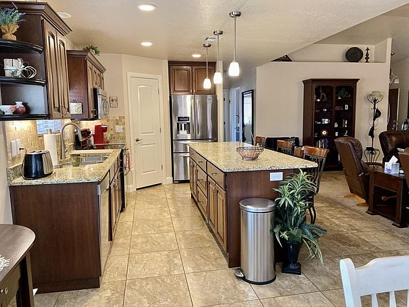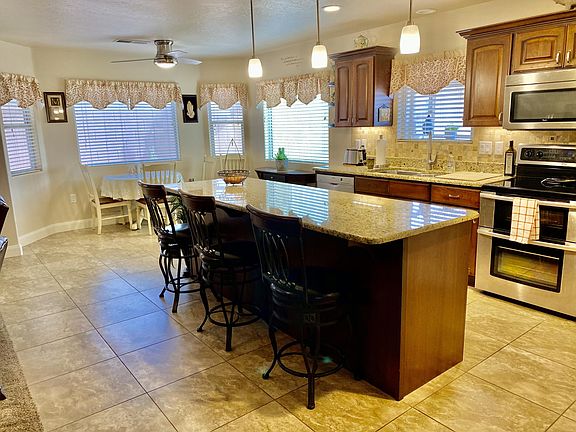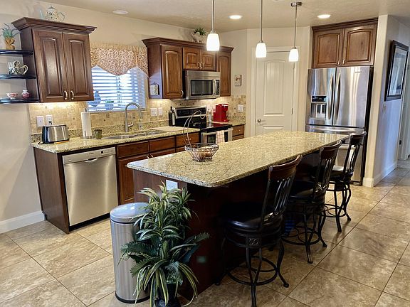 Beautiful home with large rv garage..20.7 wide, 45.1 deep, 14 high door! Full hookups. In addition, there is a carport to the side of the home for more covered parking! There are 3 covered patios, full block wall. Gorgeous kitchen with stainless steel appliances , custom cabinets, tile throughout , on demand water heater, water softener. Great location close to shopping etc.