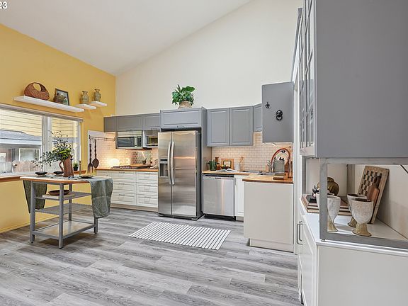 Beautifully updated attached home near Downtown Gresham with NO HOA! This home has been thoughtfully updated, including a stunning kitchen with butcher block countertops, s/s appliances, new cabinets, and new flooring throughout the main floor. The main living area boasts a vaulted ceiling with two skylights, flooding the space with natural light, as well as a half bath and a private den that can be used as an office or home gym. Upstairs features a lofted primary suite with a full bathroom plus laundry room with storage and a brand-new washer and dryer. The attached one-car garage provides easy access during rainy months, and there's a private covered back patio awaiting your gardening skills. Easy access to Downtown Gresham, Safeway, coffee shops, restaurants, the max line, and more!