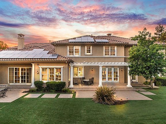 This stunning North facing custom home resides in the desirable Ruby Hill gated community on a .56-acre premium lot with views of Mt. Diablo. This luxurious home is perfect for entertaining with stately living spaces including a grand entryway with soaring high ceilings, elegant living and dining rooms, step down 400+ wine cellar storage room, an expansive kitchen/family room and upstairs bonus room with a full bar and balcony. Exquisite details radiate throughout with marble tile and oak hardwood flooring, extensive millwork, vaulted ceilings and designer lighting fixtures. The main level offers a sought-after spacious guest suite with a full ensuite bath and access to the backyard, perfect for overnight guests. The gourmet chef’s kitchen is specifically designed to be an entertainer's dream and opens to the inviting family room with custom built-ins and a brick fireplace. Enjoy top of the line built-in SS appliances, double ovens, custom tiled backsplash, granite countertops, oversized center island with a prep sink, wrap around breakfast bar, walk-in pantry and sunny dining nook. Venture upstairs to your spacious primary suite featuring high ceilings, gas fireplace and a private balcony with views of the surrounding hills. Relax in the spa-like ensuite bath which boasts split vanities, jetted soaking tub, oversized walk-in shower and an expansive walk-in closet with custom built-ins. Once outside, spend precious time with family and friends in the spectacular private backyard. Sit back and relax on the sprawling patio or practice your golf game on the custom putting green. Home has fully owned solar. Wonderful gated golf course community with a Jack Nicklaus designed course. Conveniently located near parks, shopping, dining and top-rated Pleasanton schools. Close proximity to downtown Pleasanton and Livermore wineries.