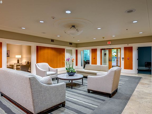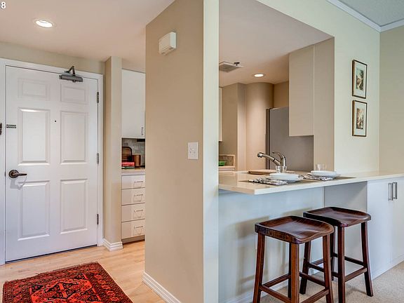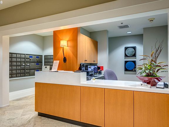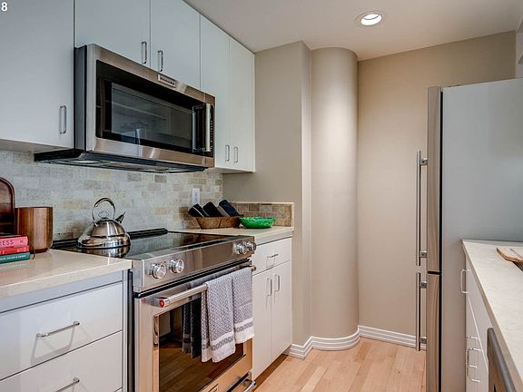Beautifully done condo at the Legends building in the heart of SW Portland. Light and bright, this unit is a one-bedroom plus office nook, great views from every angle and well-appointed details. High-spec stainless steel appliances in the kitchen, laminate wood floors in the entry and kitchen, quartz countertops, elegant bathroom remodel with travertine floors and counters, oversized shower. Large bedroom and custom walk-in closet.