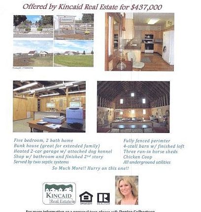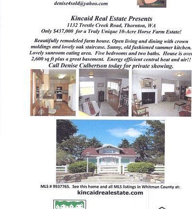 PUBLIC OPEN HOUSE: Sat. June 30th 9am-noon. Come by for a look! MOTIVATED SELLERS JUST SAID OK TO A HUGE PRICE REDUCTION and are anxious for you to see their unique 10 acres with beautiful 1943 2-story, 5 BR, 2BA farm house and numerous, customized outbuildings. Home features open kitchen, dining & living area. Barn with 4 stalls & finished loft. Bunk house for extended family has 1 BR & bath. Two-story shop with A/C & heat, bathrm w/ W D area, upstairs loft w/ sleeping quarters. Fenced perimeter for horses w/ 3 run-in sheds. Riding arena. Chicken coop. Double car garage. Machine shed with heated shop. One m. off Hwy 195;19mi from Colfax. So much more! Call me TODAY to see this one-of-a-kind property! DENISE CULBERTSON 509-288-0466 denise4sold@yahoo.com