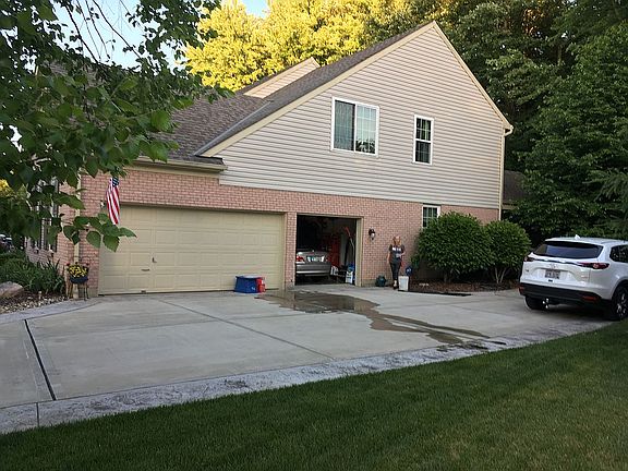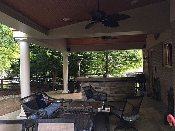 Fantastic stamped concrete back patio with two gas fire pits, wired with speakers, big screen TV, pitched roof with bead board stained cathedral ceilings, stone bar with fridge, two ceiling fans. An outdoor living room.