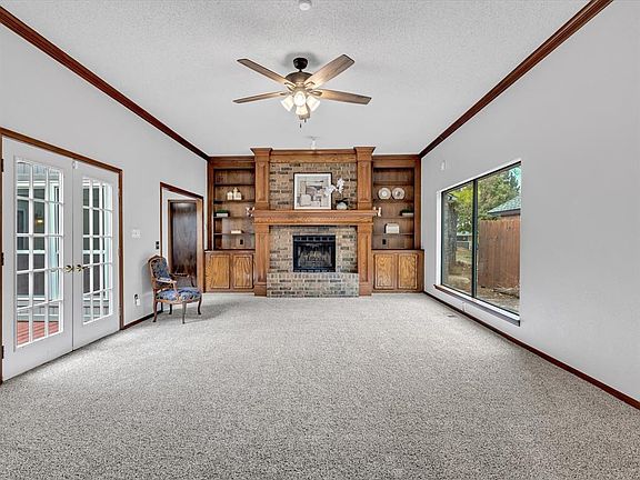 The living room features a beautiful fireplace, built-in bookcases, and crown molding, adding warmth and character. The kitchen has been updated with granite countertops and a tile backsplash and offers plenty of space with a breakfast bar and dining area that opens to the back patio. The spacious primary suite includes a private bath with a jetted tub, a huge walk-in closet, and double doors leading to the atrium.