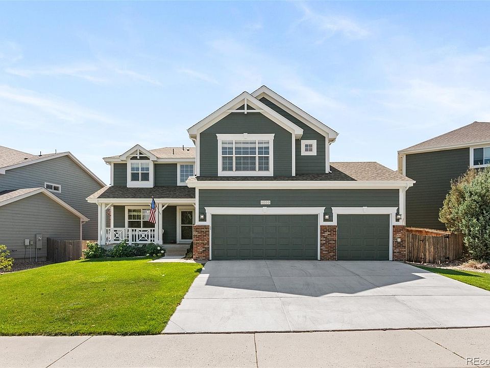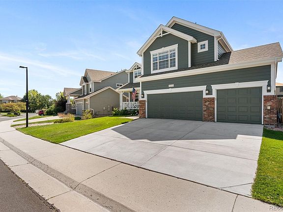 This home is beautiful inside and out! This home just says welcome home from the time you walk up to the covered porch to walking into the grand foyer. The beautiful wood floors flow throughout the main level. The dining room is warm and welcoming, flowing into the kitchen for easy entertaining. The light and bright kitchen is a dream with tons of cabinets and full pantry, the breakfast nook gives easy access to the huge back deck and gorgeous backyard! Relax unwind and enjoy the privacy of the fenced backyard. Cozy up in the living room and relax by the gas fireplace. Upstairs the large loft area can be used as a family room, converted into an additional bedroom, or a office. The primary bedroom has room for all of your furniture including room for both nightstands, the ensuite 5 piece bath with large walk-in closet is a must see! The second bedroom is light and airy with a attached full bathroom. The third bedroom has access to the full bath as well. Laundry is located on the second floor by the bedrooms. The full unfinished basement is ready to make your own with stub out for an additional bath. The 3 car garage is finished and oversized with room for storage and much more! Right across the street from the home is a park, walking trails and more. Easy access to I25, DIA, Denver, DTC, shopping, restaurants, and much more.** New Furnace and Air Conditioner **New impact resistant roof this will provide savings on insurance.**