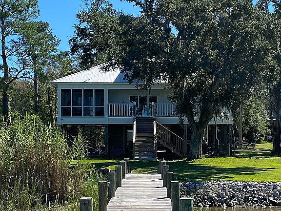 Beautiful home on Weeks Bay, 1.9 acres, some wetlands, live oaks, deep water, access to Magnolia and Fish river, intercoastal waterway and Mobile Bay. Boater's delight, fisherman's paradise. 240 ft. pier with boat slip, boat lift and boat house. Breathtaking sunsets.