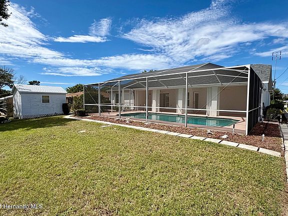Come make this home your own! This 3 bedroom, 2 bath, 2 car POOL home is ready for just a couple modern touches. NEW ROOF just completed along with NEW POOL FILTER/TANK. Home also has newer pool screening & updated DBL PANE WINDOWS throughout W/ Hurricane shutters for peace of mind. Master has pool access as does kitchen,living room & back bedrooms. Whole house Irrigation & w/wrap around walkway leads you to a STORAGE SHED to help keep the garage less cluttered. Inside laundry room w/ washer & dryer & storage cabinets. Great location near ample amenities & all Hernando county has to offer!