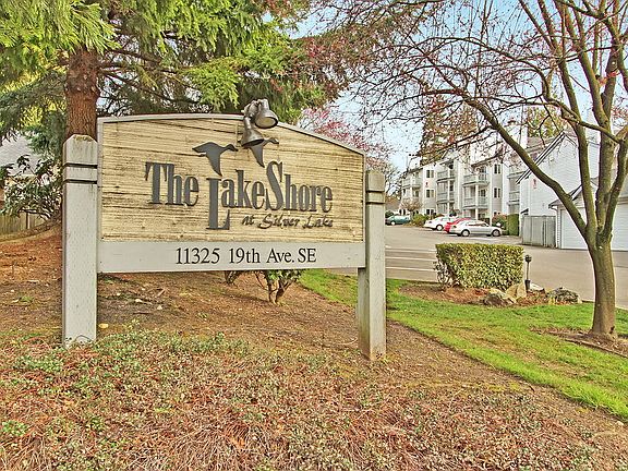 Rare Top Floor Lake View Condo. Pristine corner unit w/ only one shared wall. Open floor plan with vaulted ceilings. Huge living & dining room w/ lake view, fireplace & slider to BBQ deck. Large kitchen w/loads of cabinets, counter space and wonderful view of lake. Master suite features en suite bath. Separate full sized laundry room. Newer washer/dryer stays w/ unit. Full sized garage w/ additional parking space. The Lake Shore is a small, stable well managed complex across from Silver Lake.