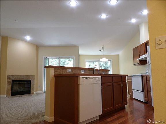 Private top floor end unit w/its own staircase and one flight of stairs. Wide entryway with a guest closet you can "walkinto''. Open concept floorplan from kitchen to dining to living room. Vaulted ceilings, recessed lighting, kitchen island, separate dining area, covered deck Master w/walk in closet, Second bedroom small-den, office, nursery. Has regular closet and window. Shopping, Park & ride and 3 waterfront parks nearby with one directly across the street (no cars park) High ownership complex with rent cap. $5500 credit towards new appliances