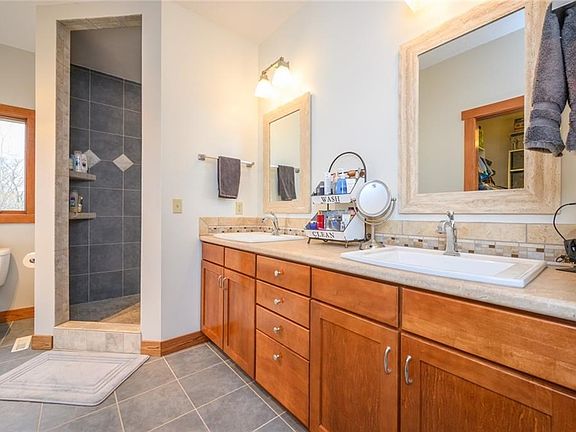 Arts and Crafts 3 bedroom Ranch on a 2 acre lot. Great floor plan for entertaining. Formal dining/office. Living room features large windows looking out at the beautiful countryside view. Eat in kitchen with Cherry cabinetry, granite counters, walk in pantry and stainless steel appliances. Kitchen flows in to the 4 seasons porch with gas fireplace. Walk out on to the 18 x 11 deck to a fully fenced acre and enjoy the gorgeous view and beautiful landscaping. Comfortable Master Suite with tiled shower, jetted tub and walk in closet. Walk out lower level featuring 2 bedrooms, full bath, family room, theater room, exercise room, workshop and storage. Lower patio is screened in. Geothermal keeps the utility bills low. Oversized 3 car Garage and 2 x 6 construction. Hot tub included. Easy commute to downtown.