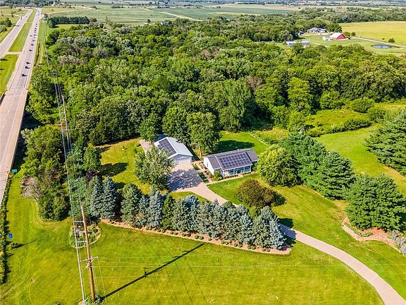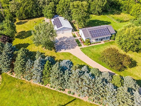 Sweet acreage for sale in Grimes! One-of-a-kind property features a long, winding concrete driveway, mature pine trees, and backs to a grove of trees dipping down into Beaver Creek. This ranch offers 3 bedrooms, 3 baths on 1.63 acres, and is across from Beaver Creek Golf Club. With 39 solar panels, you'll save significantly on electric bills. The property includes an owned propane tank with backup generator. The siding and roof on the home were new in 2022. Other features include a radon mitigation system, Xenia rural water, and well water for the garden. Heat pump and AC new within 5 yrs. The finished lower level (except ceiling) includes a family/rec room, office, bath, 4th bedroom with an egress window. The garages are the highlight! There's a detached 4+ car garage with ample room for a boat and other toys, plus a workshop. The west side has a gravel driveway perfect for RV storage. Behind garage is another 1+ car garage and another garage fitting a ZTR mower. Johnston schools.