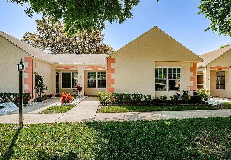 One or more photo(s) has been virtually staged. Motivated Seller, bring your offers! Welcome to Chateau Village a community within Timber Oaks. Enjoy this beautiful community which is maintenance free and the HOA fee covers all utilities except electricity(Trash, Water, Cable TV, Internet, Exteriror & Pool maintenance all included). Spend time enjoying the pool, clubhouse, play tennis and enjoy all the other amenities while surrounded by lovely maintained landscaping within this tranquil community. This charming 2 bedroom, 2 bathroom villa includes washer and dryer, new garage door, expanded living area, and a newly renovated owners suite bathroom with an enclosed walk-in shower. The owner site offers a generous walk-in closet with built in shelves. A very special feature of this villa is the atrium that sits between the dining area and kitchen nestled between 2 sliding doors. Use your own creativity to create a beautiful landscape within this atrium. The open floor plan of this villa is welcoming and light and bright, the open kitchen boasts wood cabinets and stainless steel appliances. A wet-bar compliments the dining area making entertaining a breeze. Come see what all this villa and community has to offer! Chateau Village is 37 miles from Tampa International's Airport, 5 miles from Hudson Beach, 36 miles from Award-winning Clearwater Beach, 29 miles to the very popular Downtown Dunedin and 17 miles to Tarpon Springs and 48 miles to Crystal River. This is a 55+ community.