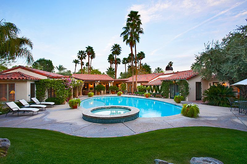 Originally designed by Cliff May, this Spanish style home in the heart of Old Las Palmas is a home that defines luxurious and beautiful desert living. On over a half acre the property sits tucked behind mature trees and along a curved street. Stunning western views and a slight nod to the south with u-shaped design framing the mountains of San Jacinto. Gated entry and gracious walkway welcomes to expansive lawn. Upon entering wood vaulted ceilings offer volume and doors to the pool easily connect the indoor and outdoor living spaces. The ultimate entertainer's kitchen with huge island, dining area and den with Fireplace is the perfect place for large gatherings or just a quiet night at home. Nearby, you'll find a beautiful bar and lounge with built in wine cabinet and powder room. Two bedrooms in the main house and two room, guest-house provide unparalleled separation of space and all bedrooms are en-suite with the master bedroom enjoying two bathrooms.
