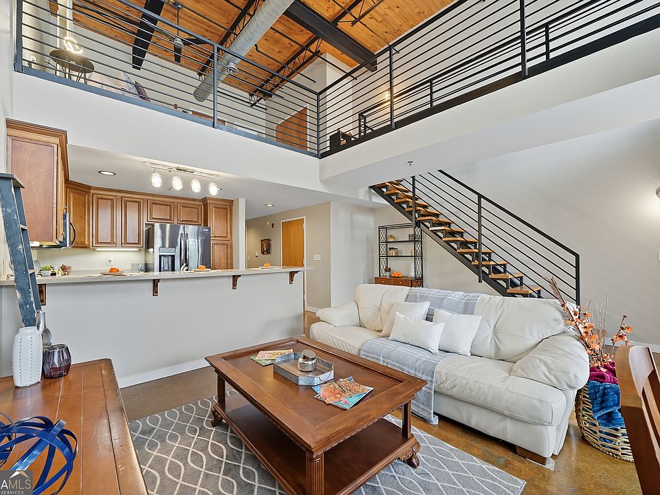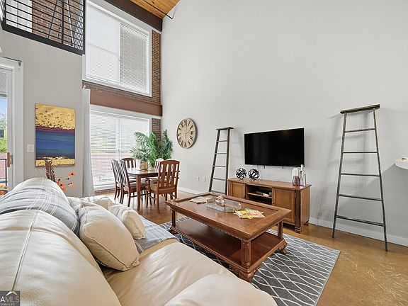 Two-level industrial loft in historic downtown Covington, known as the "Hollywood of the South." This exclusive 12-unit community offers a rare opportunity to own a residence that blends city style with southern charm. The home features soaring wood-inlay ceilings, exposed beams, polished concrete floors, and dramatic two-story windows that fill the space with natural light. The main level includes an open living and dining area, a crisp kitchen, a guest bedroom with full bath, and access to a covered patio for morning coffee or evening relaxation. Upstairs, the loft-style primary suite spans the catwalk with a sitting area, large walk-in closet, and a spa-inspired bathroom with double vanities, a soaking tub, and a spacious double shower. A laundry closet with washer and dryer adds everyday convenience. From your doorstep, you can walk to Covington Square's shops, restaurants, and year-round festivals. Academy Springs Park, antique stores, art galleries, and the popular Mystic Falls tour are also nearby. Reserved covered parking and guest spaces make this home both practical and inviting.