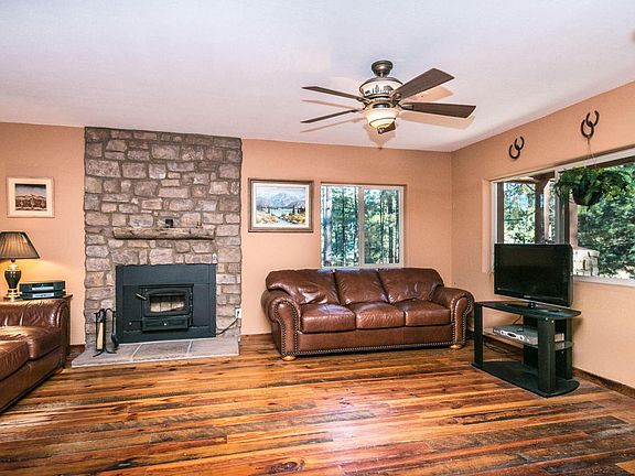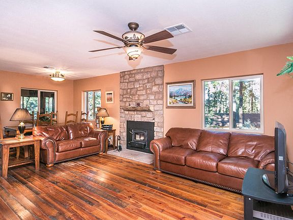 Beautiful home in the tall pines. Approach the front with lovely wood beams and stone welcoming you. From the moment you walk in you feel the great outdoors from the comfort of a 3bed/2bath cabin with central heat & air. Incredible Vintage Hardwood Floors, finished AZ room with tongue and groove ceilings, glass all around so you can view the ''backyard visitors''. There are two wood stoves, an acre of land and a SIX car garage for all your outdoor toys with a man cave/workshop. Perfect for a year round home or second home.