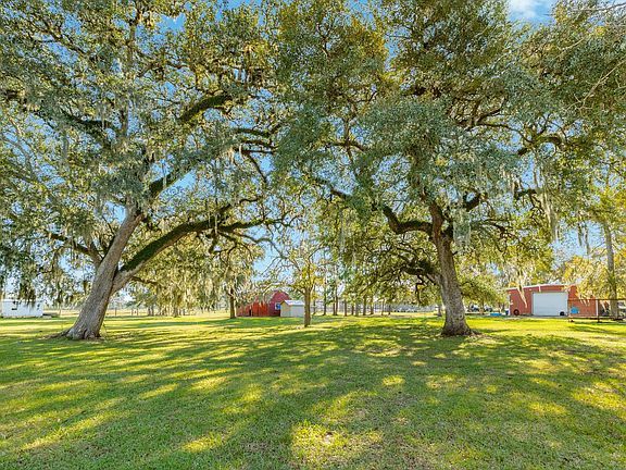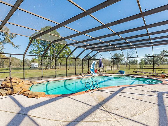 Spacious 4.06-acre property with a screened-in pool, hot tub, and multiple outbuildings. The main home offers approximately 2,398 sq ft with generous living spaces, a large kitchen, and views of sprawling oak trees throughout the property. The screened enclosure covers the pool, hot tub, and detached garage area, creating comfortable year-round outdoor use. Recent updates include a new roof installed in 2025 and fresh exterior paint. The property is fully fenced with an electric gated entrance and includes a recently added 30x60 spray-foamed metal building, a large 40x50 shop with lean-to, and an additional small barn. Quiet country setting with convenient access to Sweeny and West Columbia.