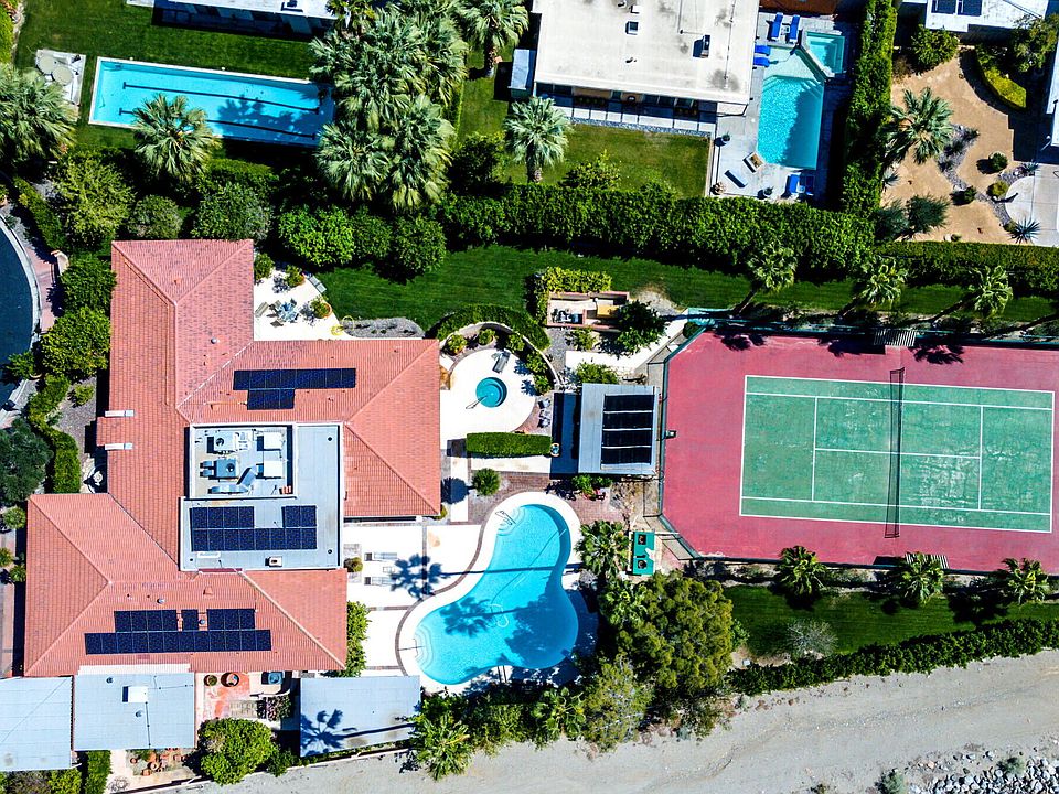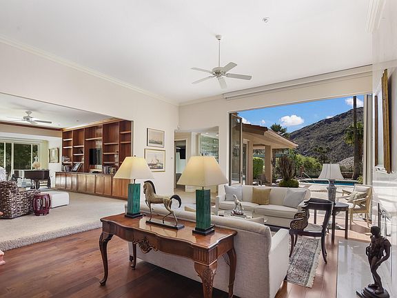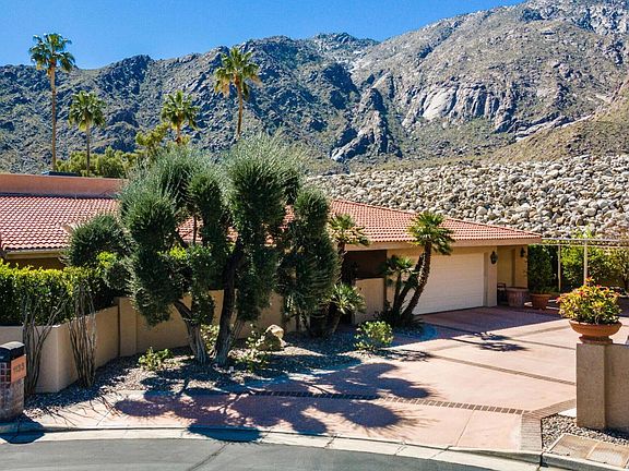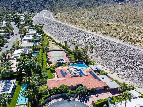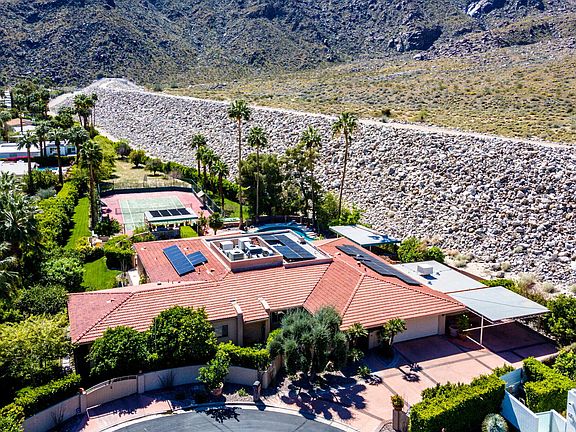 Located at the very end of a gated cul-de-sac street in the Vista Las Robles enclave of Palm Springs' highly coveted Vista Las Palmas neighborhood, this rare residence enjoys an exclusive location and unobstructed mountain views. The sprawling single-level residence boasts an exceptionally large homesite of about 1.13 acres, allowing ample room for a large pool, a spa, tennis court, covered patios and a long driveway for guest parking. Indoors, an open 4-bedroom, 4-bath floorplan is generously proportioned at approx. 4,129 s.f. and primed for entertaining with a formal double-door foyer, a formal dining room, and a step-down formal living room with high ceilings, a wet bar, fold-away glass doors to the backyard and a dramatic fireplace with book-matched marble surrounds. An oversized family room with extensive built-in cabinetry is ideal for relaxation, and the updated kitchen hosts a nook, attached service room, granite countertops with full backsplash, and high-end stainless steel appliances including a built-in refrigerator and 2 dishwashers. Dual primary suites are revealed, with one opening to a private patio and lawn and the other accessing the backyard and a private spa.