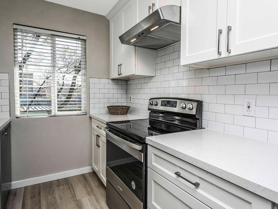Completely remodeled unit, top to bottom, everything BRAND NEW. New wood-like flooring, new shaker white kitchen cabinets with new quartz counter tops, Bathroom completely gutted and replaced with walk in marble-like tile shower, vanity and quartz counter tops. I year lease. Available NOW. Includes trash and water. Tenant pays for PGE and cable/internet.