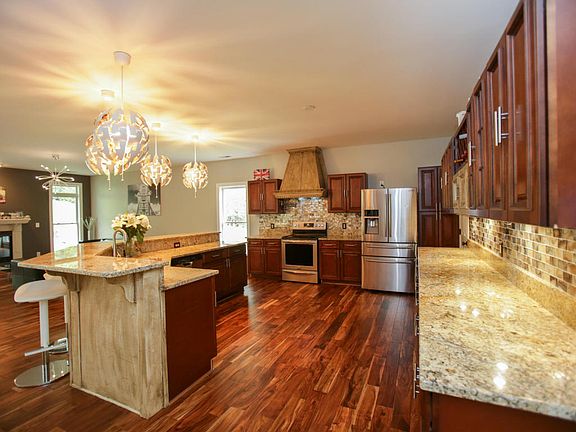 Modern living located on 2+ acres of a private wooded retreat. The open floor plan features 5000 square feet of comfort and style. The front door was built and shipped from California to set the tone of the property. New Flooring and modern lights throughout light your way to the open kitchen, dining room, and living room areas. The kitchen features granite, breakfast bar and a tremendous amount of cabinetry, countertops, and a pantry. The master suite faces the private backyard. Deluxe master bath. 4 bedrooms have attached bathrooms. Big family room in lower level. Wonderful screened in covered back porch with Tile and trex raining, extensive flagstone patio with fire circle. Attached 2.5 car garage. Gated drive, security system, and countless other improvements throughout.