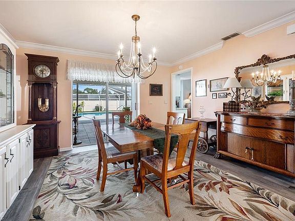 This spacious home is a perfect Family Home or Entertainers Dream. Featuring an Open Floor Plan with all the upgrades you are looking for, such as 3 Large Bedrooms, 2 Updated Baths, the Primary Bath & Kitchen were updated in 2015 with all new SS appliances, White soft close Cabinets & White Granite countertops and Sink. Inside this lovely, immaculate home you will find new Luxury Vinyl Plank flooring throughout the home, Crown Molding, a Cathedral Ceiling in the Family Room & 3 large Walk-in Closets. The Guest bathroom includes a Jetted Tub & Shower. The A/C is 2016. There is an in-residence, sizable Laundry Room with a Phantom Screen Door to the Garage providing a great breeze into the Kitchen and Family Room. The Exterior showcases a Huge Screened Lanai and Pool area as well as a large grassy backyard. The Pool is Solar Heated affording you the pleasure of swimming year round, surrounded by a Vinyl Fenced in property for privacy while you entertain as well. This is your opportunity to make a great home in a wonderful neighborhood your own. It is located in the desirable SE Cape Coral, close to all the Dining, Shopping and Bridges that the Del Prado corridor has to offer.