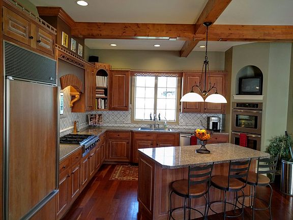 Wildwood former display home, pool, cottage style pool house & stocked pond on 3 acres. Gourmet kit. features custom cherry cabinetry, hard surface counters, stainless appliances, sub zero refrig, gas cooktop & wood beamed ceiling. Hearth rm, hardwood floors, custom woodwork thru-out, arched doorways, 10 ft ceilings, formal DR, 3 fireplaces, w/in pantry, Butler's pantry. Covered front porch in French country style, w/ beautiful flag stone & brick work. FmRm w/ beamed ceiling, gas FP & bow window overlooking pond. Huge vaulted master bedrm, bath with jetted tub. Nice sized bdrms, Jack & Jill bath. Hi-pour w/out lower-level with media rm, FmRm with wet bar, office with gas FP, full bath & workout rm. Circle drive, 3 car side entry garage. Zoned HVAC, Roof(2014), Large cedar deck(2015). Irrigation system hooked to pond. Main floor laundry w/ half-bath. Anderson windows. Lafayette high school area. Near Babler State Park All the shopping & restaurants of the Chesterfield Valley