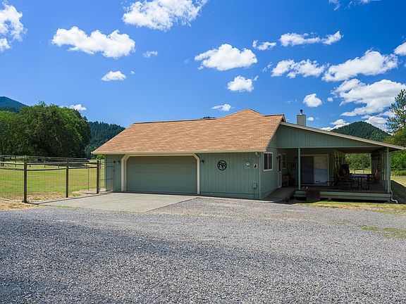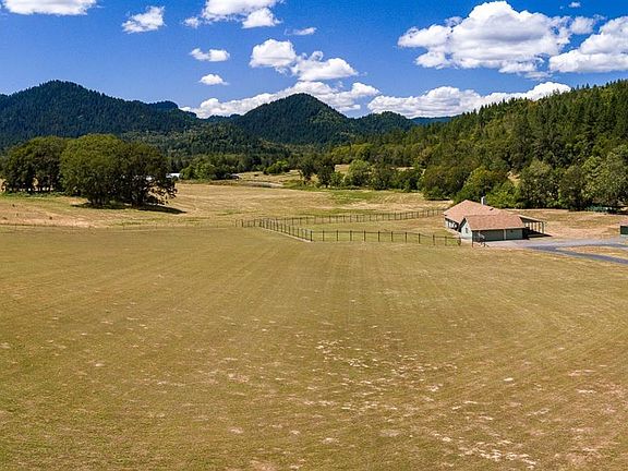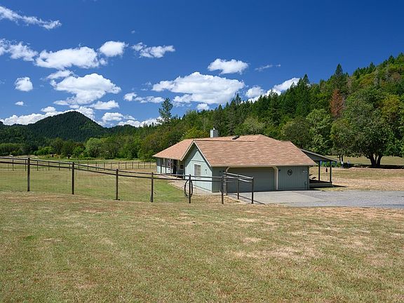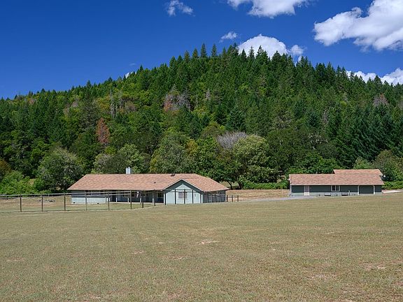 This OLD WEST style custom ranch home sits on 18.78 acres with Salmon Creek (seasonal) running through and is just past the historic covered bridge in Sunny Valley. This well built 2566 sf spacious home with vaulted ceilings, wood stove and wood flooring throughout the home includes a living room, family room, dining room and large kitchen (custom oak cabinetry with lots of storage) with 4 bedrooms and 3 baths with an attached over-sized garage. Plus an approx. 30x60 separate building divided into three sections, a shop, garage and living space. Perfect for multi generational living. Each building is metered separately, two separate septic, however, the well and propane tank are shared.
