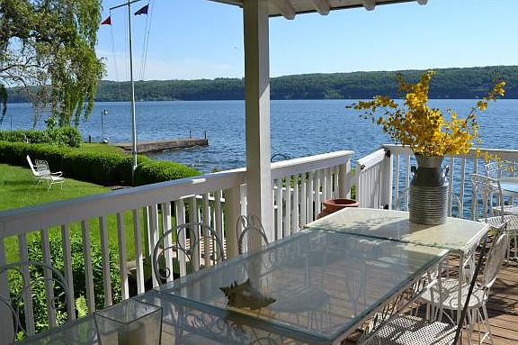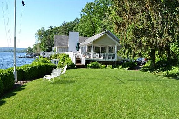 Spectacular 214 feet of lake frontage and drive to door lake house. Large grassy area, cement dock, shale beach.. yes this property has everything you've been searching for. Originally a boat house, after extensive renovations/additions in the 1960s it was converted to this 3BR, 2 bath home. WAlls of windows in dining room,living room and kitchen. Covered porch, lots of deck area and a carport. Fantastic views of Cornell and South Hill. Possibility of building another house higher up on the lot. Start living your dream today.