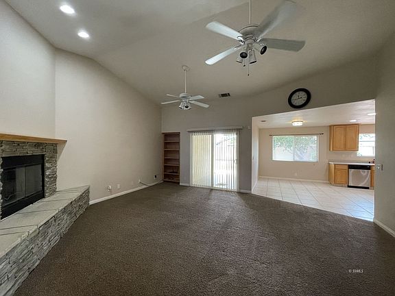 Beautiful 3 bedroom, 2 bath home built in 2006. Covered entry leads to a beautiful carpeted living room with a fireplace and dual ceiling fans. Tiled dining room is off the living area and adjacent to the large open kitchen. Large open kitchen features corian countertops, deep sink, dishwasher, gas stove with microwave and pantry. Bedrooms are split with the master bedroom located on the east side of home and the two guest bedrooms located on the west side of the home. Large master bathroom with two separate walk in closets, oversized soaking tub, separate tiled shower and double sinks. Home has inside utility room with extra cabinets, laundry hookups and garage access. Beautiful glass sliding doors in the living area gives access to the backyard. As you walk into the back yard, you'll notice the attached covered patio area in addition to a cement sidewalk wrapping around the house. Large two car finished garage with epoxy flooring and automatic door.