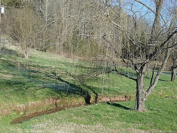 Situated on quiet country road, with spring fed pond and branch through property. Hardwood, Detached garage with 3 stall carport, five stall pole barn. Concrete driveway.