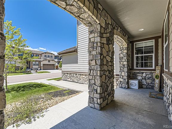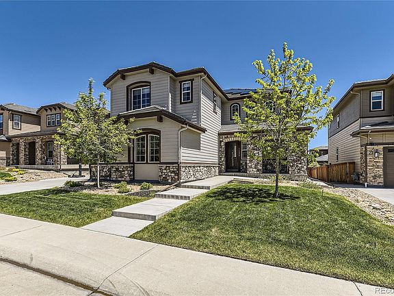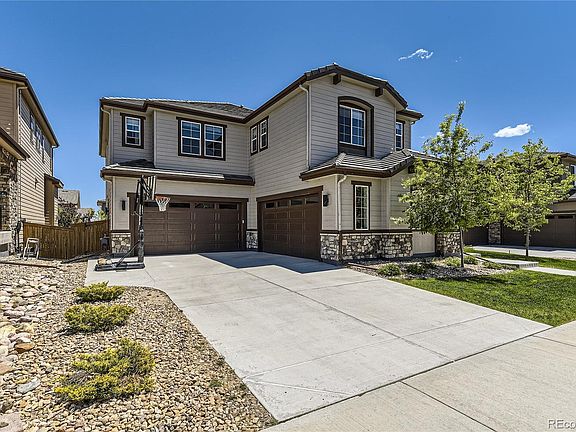 PRICE IMPROVEMENT! Have your breath taken away by this lovely Shea-built home from their Stonewalk Collection, the Evergold! There are 6 bedrooms, 8 bathroom and a 4-car garage. Yes, you read that right. This is one of the most coveted neighborhoods in all of Parker, but what makes it even better is the finished basement with 10-foot ceilings. The curb appeal matches what is inside, too. The minute you enter, you feel the warmth of "Home." It will not take long to fall in love. Luxury vinyl (oversized) plank floors are on the main floor, complemented by the floor-to-ceiling fireplace tile wall with exposed beams. This home has so much room you will never want to leave. The kitchen is oversized with a chef's set-up, with 2-dishwashers and a wine fridge. The dining room ties it all together with windows that boast the natural sunlight, which there is no shortage of here in this home. There is a main floor bedroom with a private full bathroom, too, and that does not include the powder room for guests. Head upstairs, and you will find 4 bedrooms on this level, along with a loft and laundry room, so you no longer have to transport laundry up and down the stairs. Every bedroom is a suite with a full-size bathroom and generous closets, too. The primary bedroom has raised ceilings and an oversized, upgraded closet with a vanity sitting area. The primary bathroom has 2 sinks, a free-standing tub, and 2 shower heads! It only improves when you head downstairs to enjoy the theater room, wet bar, and golf simulator. There is another bedroom in the basement with its own private bathroom, making it feel like an oasis for guests. There is a powder room right behind the movie theater. Lastly, a workout area in the unfinished portion of the basement brings it all together, making this the home your dreams. The backyard has a covered patio with lighting and gas value for grilling. What else could you want? There is a community pool as well. Come by the home before it is too late!!