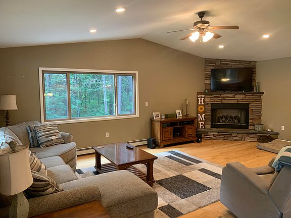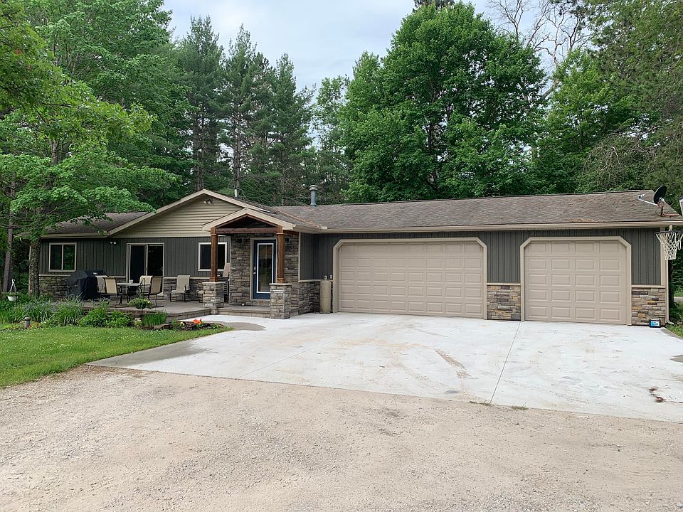 WOW! Lots to offer here. Let's start off with 10 acres across the road from State Land. 2100 Sq ft on the main level with 3 bedrooms and 2 baths. Open living area with a large kitchen and solid core counter tops, dining area and living room with a stone fireplace. Floors are ceramic and maple. Sliding glass door opens out to a 20x16 patio with stamped concrete. Attached 3 car garage. The full walkout basement is mostly finished with 2 bedrooms (yes that is 5 bedrooms total) that have egress windows, a full bath, a kitchen area, living area, workout area and two large storage areas. The walkout consists of two levels of patio with a hot tub on one level and a cement firepit area. Think that is enough? Well how bout a new 40x64 pole barn with two 12x60 lean-tos on each side. One of which has a cement floor where the outside wood boiler is located! Inside boiler and baseboards are being replaced. Wood floors will be refinished once seller moves out.