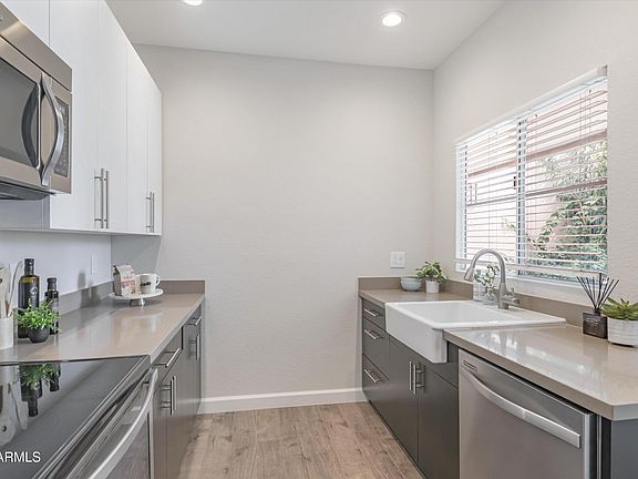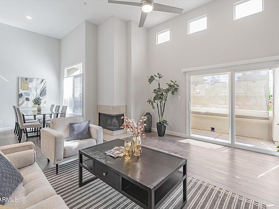 Immaculate. Highly desired Casita Model End Unit, no neighbor above in Prime Location. Very Private. Extra tall ceilings! Meticulously remodeled to perfection, including faux wood flooring, new interior paint throughout, all new windows & window coverings. Completely remodeled and reconfigured kitchen features gorgeous white cabinets with upscale hardware and expansive engineered quartz counters for ample workspace. Stainless-steel Whirlpool microwave, refrigerator, ice maker, dishwasher and sleek electric induction cooktop for effortless cooking. Stackable full-size Kenmore washer and dryer. New carpet in both bedrooms. Both bathrooms have been completely updated with new tile, lighting, counters, hardware, cabinets, (see MORE comment This beautiful unit has a private covered patio, perfect for enjoying your morning coffee or evening relaxtion, and an indoor fireplace to keep you cozy on cooler evenings. New HVAC system in 2020. New tankless water heater in 2023. Experience the best of resort-style living in the coveted Mission Del Arroyos community - a 236-unit condominium complex on Shea Blvd and 92nd St. This beautiful community features 2 pools, spa, tennis, and fitness center. Located near freeway access, shopping, restaurants, entertainment district, golfing and hiking. Shea Honor Health Medical Center and the Mayo Clinic are a short drive away. All this at your fingertips. Make this your next home!