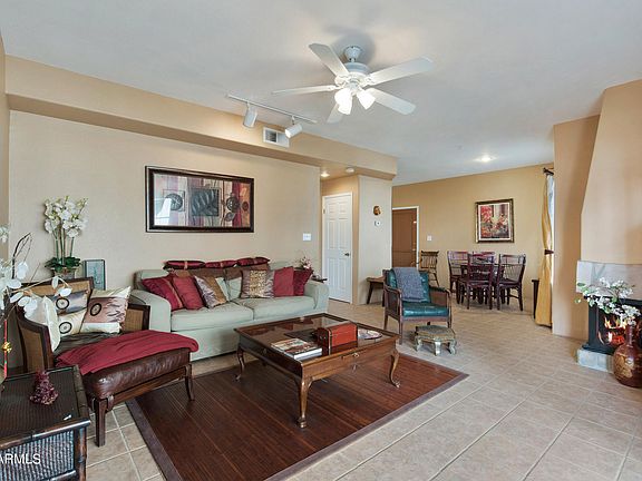 Model-sharp first floor end unit, conveniently located within the complex. Second home, very rarely used. This 2 bedroom/2 bath unit features tile flooring, updated kitchen with custom cabinets, fireplace, spacious master with walk-in closet, private patio off of family room, tall ceilings, and best of all, very short distance to shopping, restaurants, Honor Health Hospital, and Loop 101. Steps from community pool & spa and rec room/fitness. Can be sold furnished, minus a few personal items. Can move right in! You won't be disappointed!