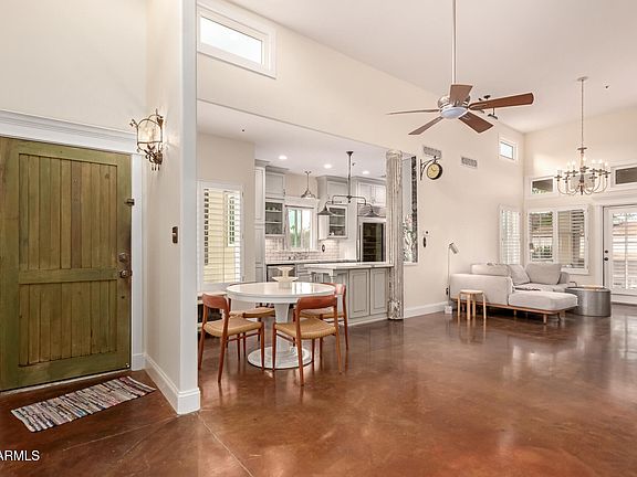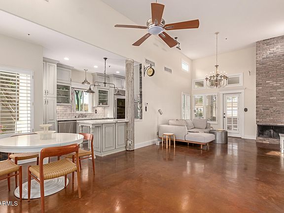 Fall in love with this bright, open layout featuring soaring ceilings, clerestory windows bathing the home in natural light, plantation shutters, sleek concrete flooring, and a cozy fireplace for relaxing evenings. The chef's kitchen showcases quartz countertops, breakfast bar, custom cabinetry with crown moulding, a tile backsplash, a pantry, and premium Wolf/Sub-Zero and Bosch appliances. Antique doors and a hand-selected column sourced from across the country add timeless charm. The main bedroom offers patio access, an ensuite with dual Kohler sinks, a walk-in shower, and a spacious closet. Step outside to a tranquil patio overlooking the community greenbelt and stunning mountain views, creating the perfect retreat.