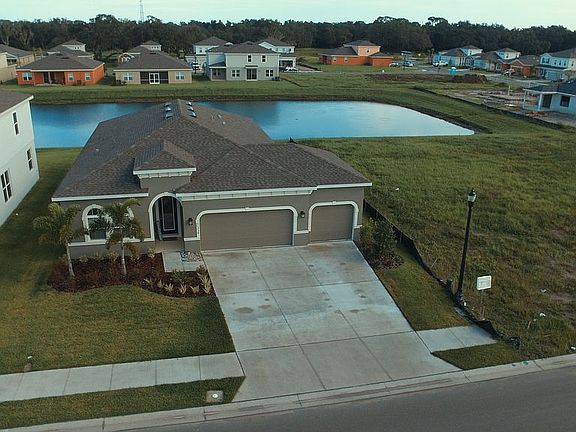 Beautiful new construction home built by Ryan Homes in March 2020 is ready for a fast move-in. This spacious open concept home has 9.5 foot ceilings throughout and 2,100 square feet of living space nestled in the perfect water-front lot in the heart of the community. The layout contains 3 bedrooms, 2 full bathrooms, and an office/den that could be used as a 4th bedroom and a 3 car garage. The grand foyer entry leads into a large family room with 6 windows offering lots of natural light and serene views of the lakeside backyard. The kitchen boosts a large gourmet island, with plenty of cabinet space, all brand new stainless steel appliances including a large walk-in pantry with ample space for storage. The dinette corner has plenty of space for a large dining table set and includes a pendant light chandelier that matches the kitchen cabinets perfectly. This is the ideal space for anyone who enjoys being in the kitchen. Sliding glass doors with a custom privacy shade lead to a covered lanai and a large backyard with plenty of space for a pool and patio to make your own. Flooring includes durable waterproof luxury vinyl throughout the house, tile in the kitchen, bathrooms and laundry room and carpet in the bedrooms. The master suite resides on its own side of the house and features a beautiful master bath with a large linen closet for storage and full walk-in closet. The laundry room includes brand new Samsung washer and dryer. The 3 car garage floor is painted with plenty of shelving for storage space and updated LED lighting. Home is under warranty with builder through March 2021. This home is perfect for family living and just minutes from grocery stores, restaurants, A rated schools and I75. The community is very friendly and has a large pool, basketball court and dog park for resident use. Contact today to schedule a home tour!