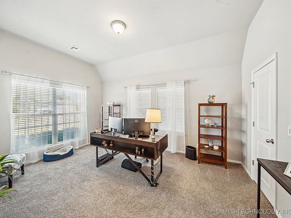 Did you miss this one last time? Here is your chance to have an amazing home! From the moment you enter, this home welcomes you with warmth. The open floor plan includes a beam-accented living room with a fireplace, ideal for entertaining. A cozy drop zone keeps rain gear tucked away, and the private office offers a quiet workspace. At the heart of the home is a chef's kitchen with an oversized island and upscale finishes, perfect for gatherings. The primary suite features a spa-like bath and a walk-in closet with a center island and abundant storage. A split-bedroom layout ensures privacy, while the upstairs flex space adapts to your needs. The oversized 3-car garage features epoxy floors, workspace, and pegboards, perfect for projects. Out back, enjoy peaceful greenbelt views, direct access to walking trails, and a spacious covered patio with a privacy screen. Established flower beds and a sprinkler system make yard care easy. Close to the neighborhood pool, park, and pond, with quick access to Tulsa Hills and the highway. Come experience for yourself this meticulously maintained home!