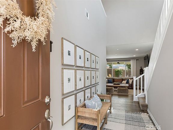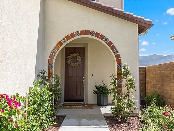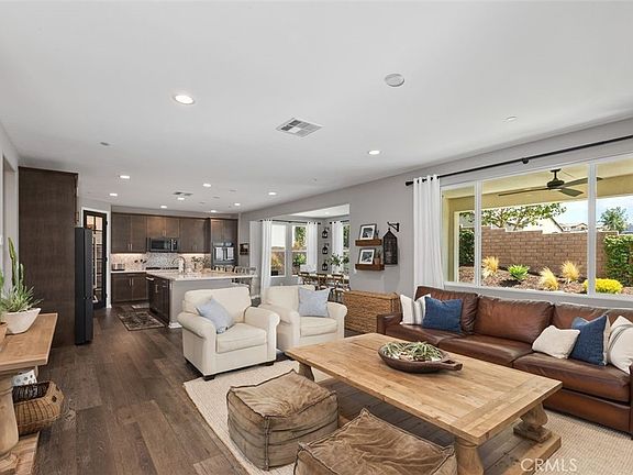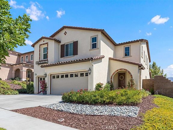 Located in a highly sought-after community of Terramor in South Corona, this stunning home has everything that you are looking for. From the moment you approach the home, the intricate Spanish tile accents, arched front entry, and vibrant landscaping create an inviting ambiance. The interior of the home features luxury vinyl plank flooring throughout the first floor of the home, high ceilings, and extra tall doorways along with many other fine details. The great room seamlessly unites the living room, kitchen, and elegant dining space. The focal point of the living room is the fireplace and mantle which is prewired for sconces and a ceiling fan. The kitchen is a chef's delight, boasting upgraded cabinets, sleek black matte GE Café series appliances, and ample storage with dual pantries. An oversized center island is ideal for gathering around. Surrounded by large windows, light fills the long dining room which is great for enjoying good food and even better company. With views of the Cleveland National Forest, the private backyard is ideal for enjoying the California room at any time of the day. The covered seating area has a fan and lighting, and the landscaped backyard is lush and beautiful all year. There is a large bedroom and a bathroom with a shower located on the first floor. Upstairs, you'll find a bonus room that is great for another living room, game room, or productive home office. There are four bedrooms upstairs including the primary suite. One of the guest bedrooms features a large walk-in closet, and the guest bath features dual sinks. The sizeable primary suite features views of the hills, a large soaking tub and separate shower, dual sinks, and a walk-in closet. Enhanced by fully paid-off solar panels and a neutral color palette, this nearly new home has been meticulously cared for, providing a seamless transition for its next fortunate owner.