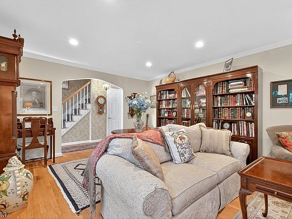 Bordering Cranford, Roselle Park and Union, discover timeless character and modern comfort in this beautifully maintained 3-bedroom, 3-bath home in the highly desirable Elmora Hills. A 1952 custom-build, this residence has been lovingly improved by only its second owner to-date, and offers approximately 2,200 sq. ft. of interior space on a generous 75x120 lot. Upon entering you're invited into the formal living room, a welcoming space to gather featuring a wood-burning fireplace and bright, east-facing canted bay window. A formal dining room leads to the spacious family room adorned with wrap-around windows, built-in media console, custom shelving, and BOSE surround-sound. Direct access to an expansive bluestone patio with natural gas connection and grill, creates ease in entertaining. The updated kitchen is a chef's dream featuring a Sub Zero refrigerator, Viking double-ovens, new cooktop, granite counters, oversized island with prep sink, and abundant cabinetry. Picture windows dressed in Ethan Allen custom wood blinds, and three large skylights fill the main level with natural light and offer serene views of the lush fenced yard. A cascading garden pond accents the multi-tiered patio, providing a calm space to relax. The upper level boasts a spacious home office with cherry wood paneled walls, easy to reconvert to the home's original fourth bedroom. A fully finished lower level provides bonus living space, laundry, and ample storage. Two zone HVAC, new 2023 furnace