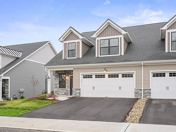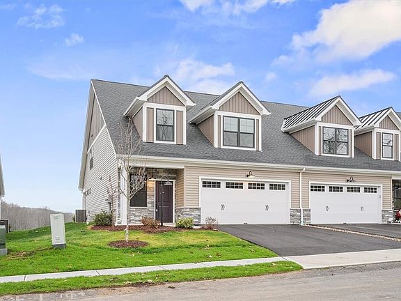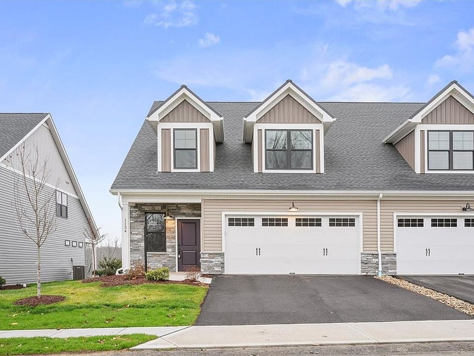 The Victoria floorplan offers 2314 SF, 3 BR/2.5 BA is the perfect blend of style, convenience and flexibility. Easy access to the clubhouse, pool, pickleball and walking trial. Close to Cranberry and Mars, plus major routes 79, 19, 76, & 228. Grass cutting, mulching and snow is covered. First-floor owners suite with tray ceiling, convenient laundry room, gourmet kitchen with island, SS appliances & walk-in pantry, open floorplan to dining and family room with tray ceiling and stone fireplace. Access to covered patio retreat. Second floor features a lounge, two large bedrooms with gable dormers for added seating or desk area, a full bathroom with double vanity, and a large storage room. This home is ideal for those who want separate spaces for family or work from home. Exterior features black windows, stacked stone entry, two-tone siding, gabled dormers with black metal roofing, and black farmhouse lighting. Savor the private green space from your covered patio.