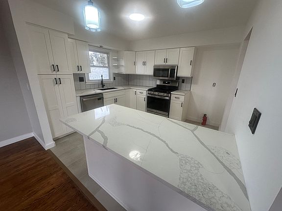 2025 Newly remodeled 3 bedroom 1 bath apartment on 2nd floor of a 2 family house. Apartment has 3 large bedrooms with double closets, large living room with dining room and brand new kitchen with brand new appliances. Kitchen has Quartz countertop along with a kitchen island, dishwasher, double sink, new stove and microwave. All new lighting throughout with modern finishes. Hardwood floors throughout. Brand new bath with double sinks linen closet, brand new shower and accessories. Apartment has its own laundry room for washer and dryer hook up with a sink in the middle. Oversized deck overlooking backyard. 1 car parking in driveway included. New central air and heat, attic space for storage. Available march 15th, showing starts this weekend. Small pers ok with pet fee, garbage and sewer included , tenant responsible for gas and electric. Requires rental insurance. 1.5 month depsot with credit/background check. Open house Saturday 12-4, and then 2-5pm on Sunday