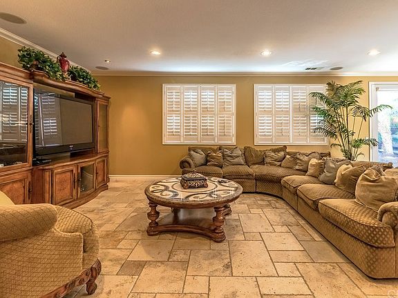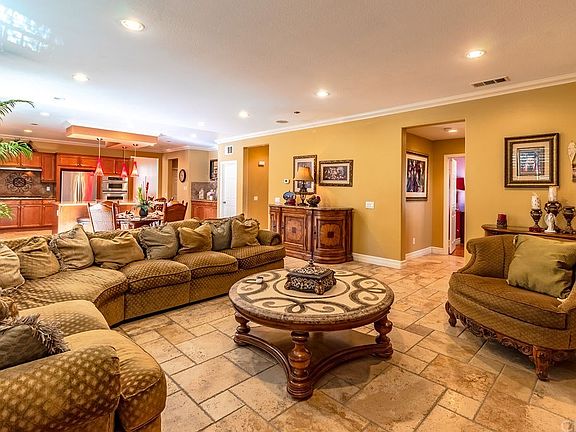 Enjoy a resort style living with this entertainers dream home in beautiful Corona! Enter the home to high ceilings and crown molding with a formal living and dining room. Travertine flooring throughout the main level. A private den for your home office, or even a library. Offers a spacious living room with surround sound system for great entertainment, a fireplace, an optional game or pool table room. Enjoy cooking for your family in a large kitchen with granite countertops, a center island, glass pendant lighting, stainless steel appliances; built in gas range, and dual ovens. Enough space to add a breakfast table. Providing you with a main level master bedroom and master bathroom. Wood flooring throughout the upstairs where you will find two spacious bedrooms that share a hall bathroom and a junior suite. Privately relax in the master bedroom that includes an additional living space. A large master bathroom with a stand alone shower and jetted tub, a vanity, and two large walk-in closets. Open the doors to your own private balcony and enjoy romantic nights. Host the next super bowl in your backyard where you have the option to watch the game, entertain, and take a quick dip in the pool all while BBQ-ing. Spanish style resort backyard, with a swimming pool and spa. A block wall with accent lighting and two Palapa style gazebos with a built in BBQ and television wiring. Large corner lot home with a two car garage parking and multiple car parking and the option of RV parking.
