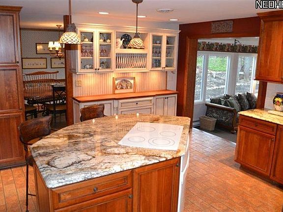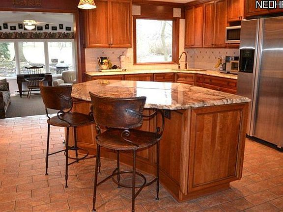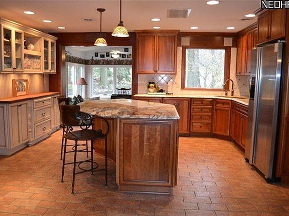 Stunning four bedroom home with updated kitchen, family room, finished lower level and sun room with sweeping views of golf course, wooded back yard and koi pond with waterfall. State-of-the-art cherry kitchen with pendant lighting over granite topped island with seating. Stainless refrigerator, Jennaire stove/oven. Antique butcher block side buffet, tile backsplash, copper spigot and wide window over kitchen sink complete the look! Pantry with pull-outs. Two fireplaces, one on first floor in family room and other in lower level rec room. Wood floors in first floor bedrooms. Master suite with updated bath with granite countertop. Fresh carpet and paint in finished lower level rec room and bedroom. Full bath and walk-in closet in lower level. Huge utility room can also be used as workshop/or craft room. Two car attached garage. Many updates. Shows great!