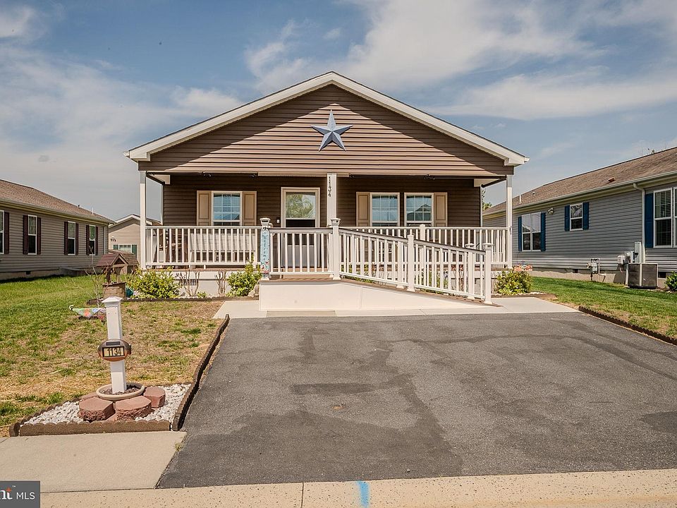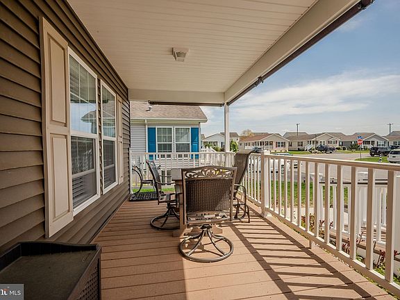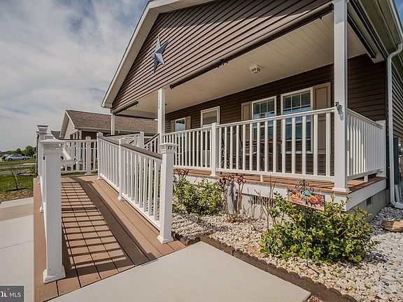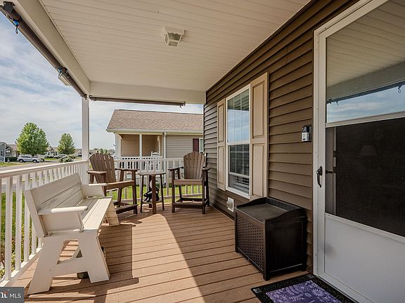GET PACKING!!!!!!! This gorgeous home in this fabulous and popular 55 + community is ready for you !!!!!!!! ONLY 5 years young !!!! One floor living! At first glance, you are greeted with a grand composite ramp that makes it easy to make your way to the large, inviting porch. It spans the full length of the home! On super sunny days use the roll down outdoor blinds to get a little shade. This front porch is just perfect for relaxing, reading and sipping on a nice warm beverage. Enter the front door to the spacious, tastefully decorated great room with classic crown molding and chair rail throughout. To the right is a formal dining area with nice linoleum floors that lead right to the kitchen. This space is a cooks dream. Newer stainless steel appliances, gas stove, built in microwave and dishwasher. There is also a built in pantry, decorative back splash, and a neat pass-through with a counter to pull up some stools and enjoy a meal or keep the cook company. Right off the kitchen is the laundry room that has convenient outdoor access. There's even crown molding in there! The washer, dryer and cabinets are included to keep supplies organized. Down the hall is the guest bedroom/office with flat screen tv included. Right across the way is the hall bath with tub/shower surround and wainscoting that gives it that something special. At the back of this charming home is the large primary bedroom complete with a sizable walk-in closet and bathroom! The en-suite has an impressive Bath Fitter shower with glass doors!(comes with lifetime transferable warranty). This room also boasts the same elegant wainscoting and crown molding. This amazing home comes with a ring doorbell with broken glass sensors and cameras. MANY More features such as ceiling fans, cordless blinds, 6 month old water heater, 6x8 shed with double doors for needed outdoor storage. But wait, there's more! There is a community pool, gym and a recreation clubhouse waiting for you to enjoy!. Many restaurants, shops, casino and the Smyrna Opera house are all near by. So close to route 1 and 13. Only an hour from the beaches!!! CHECK IT OUT!!! Don't delay. Make your appointment today!