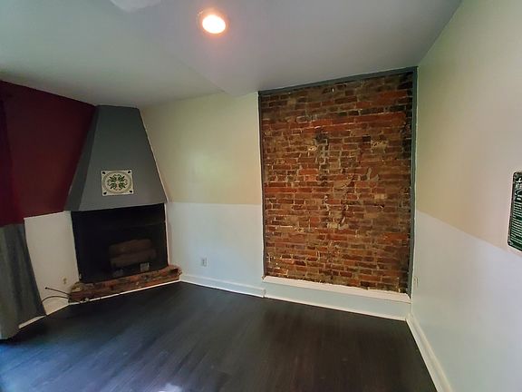 Unique layout with warm Living room with exposed brick and gray hardwood flooring.