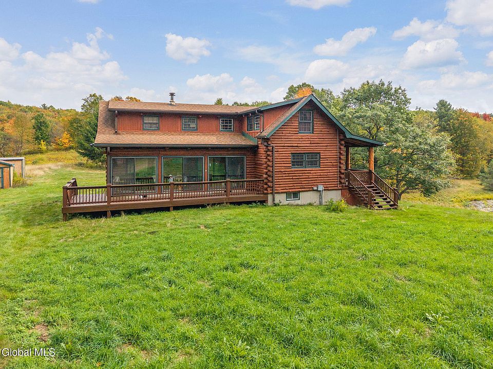FRESH ON THE MARKET! Absolute beautiful authentic log home, fully furnished, hidden on 28 acres, including a 5 ACRE LAKE, of the Northern Foothills of the great New York Catskills. This year-round custom built home has everything to make your country living a pleasure. Abundant bedrooms, baths, and an overwhelming 38 ft kitchen/dining/living- Great Room with a massive stone fireplace and plenty of glass to sit and look out over your own 5-acre spring fed lake. Solid pine logs, beams, walls, and hem/fir flooring throughout will sooth you mind. There also is a large two-story barn/garage with plenty of room for your vehicles, ''toys'' The finished second floor is one large studio room or possible guest retreat. All this privacy but only 30 mins to 3 Universities, Oneonta, Cobleskill, and famous Cooperstown with lakes, restaurants, Baseball Hall of Fame and much more. See you here on ____________?
