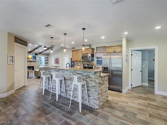 Nestled amidst 2.5 acres of picturesque countryside with barn & pond in North Fort Myers, this exquisite 4 bedroom, 2-bathroom home offers a haven of tranquility and modern comfort. Boasting a freshly painted exterior and wood-look tile flooring throughout, the interior exudes timeless elegance. Vaulted ceilings with exposed beams grace the spacious living room, while a full home reverse osmosis system, installed in 2021, ensures pure water for all.